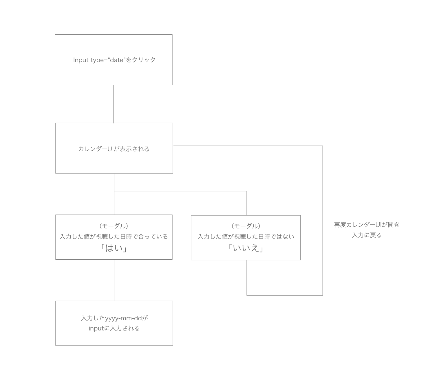 目的: 「入力日」と「視聴日」の入力項目が混在しているフォームにおいて、ユーザーが誤って両方に同じ日付を入れてしまうミスを防ぎたい。そのため、視聴日を選択した直後に「確認モーダル」を表示させます。