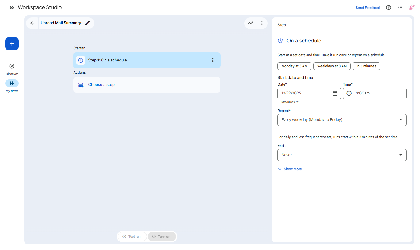 今回は、毎朝9時に未読メールをまとめて通知してくれるワークフローを作ってみようと思いますので、「Starter」には「On a schedule」を選択します。