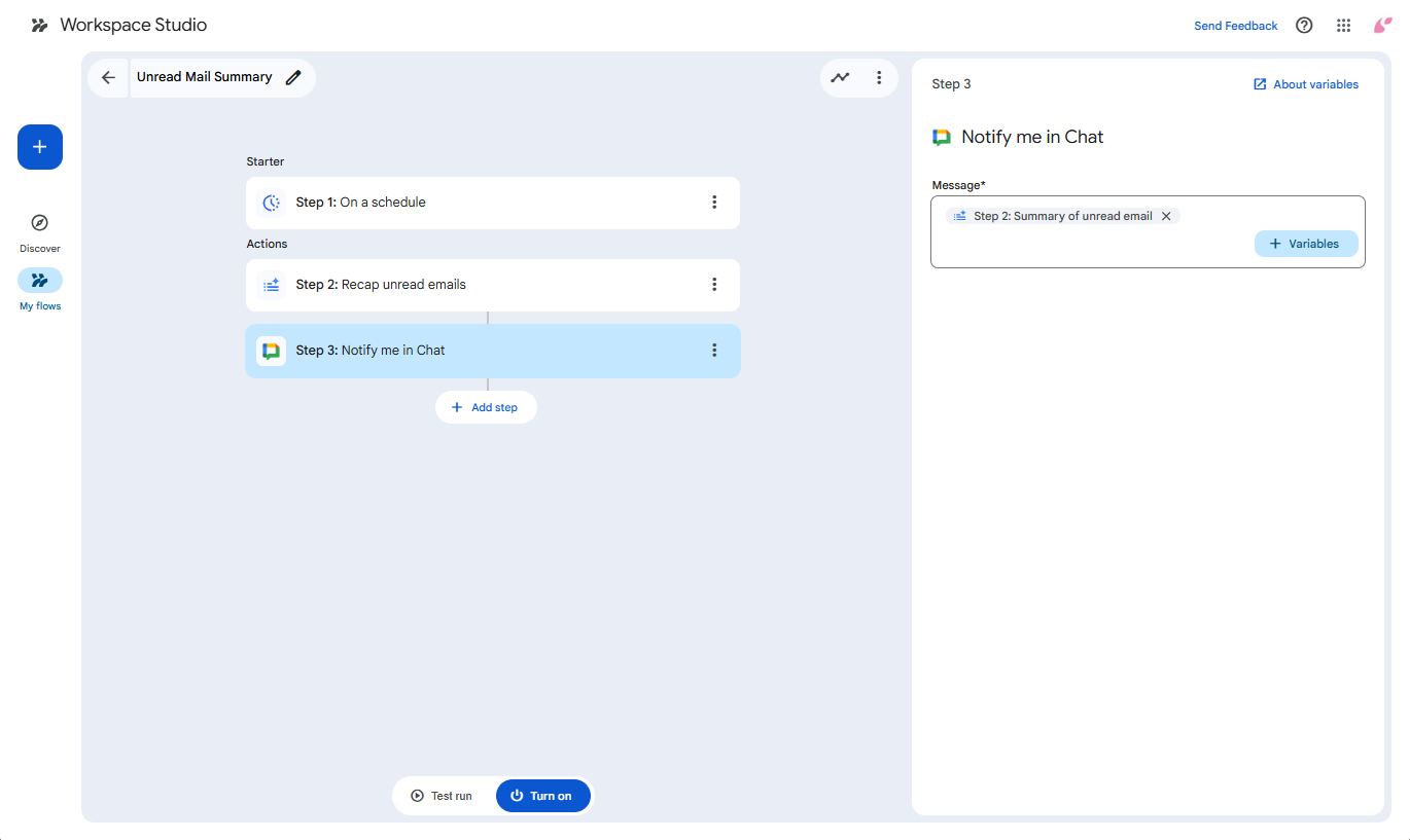 そして「Notify me in Chat」のStepを追加し、Step2でまとめた内容をチャットに通知してもらいます。
