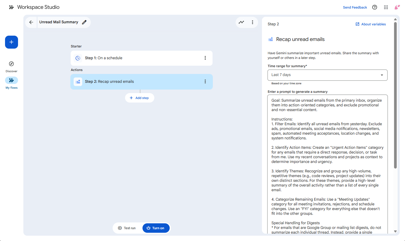 また「Actions」には「Recap unread emails」を選択します。デフォルトのままだと英語で出力されるため、日本語で出力するよう命令を追加してみるとよさそうです。