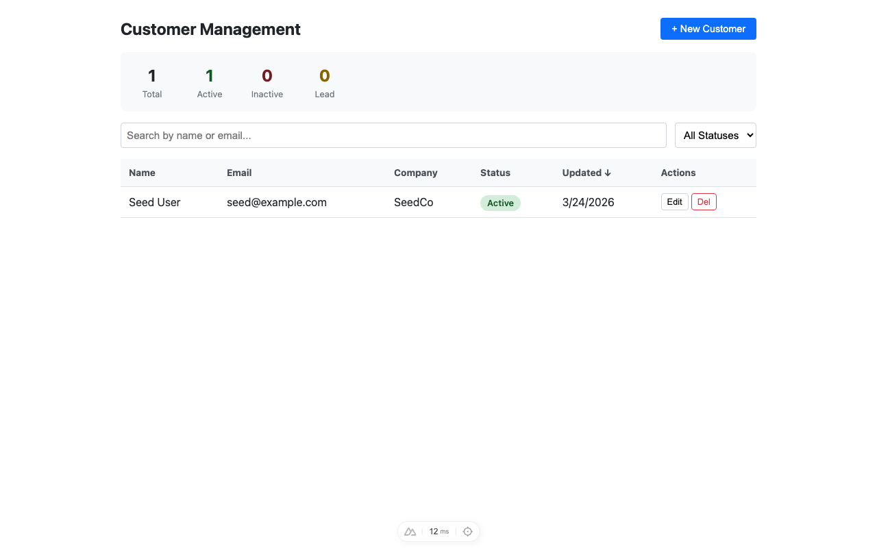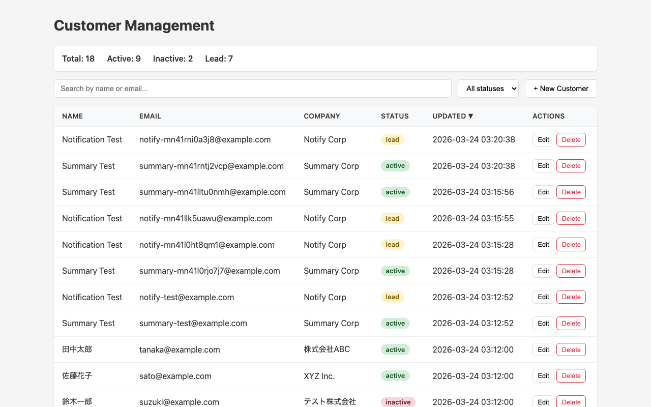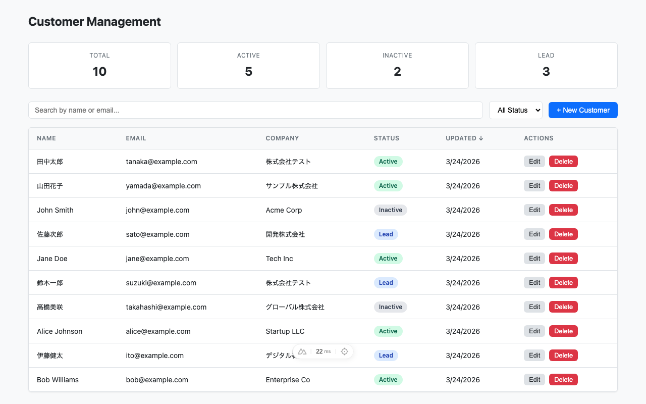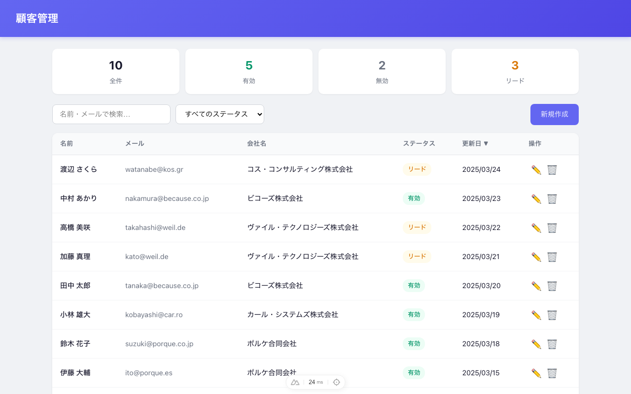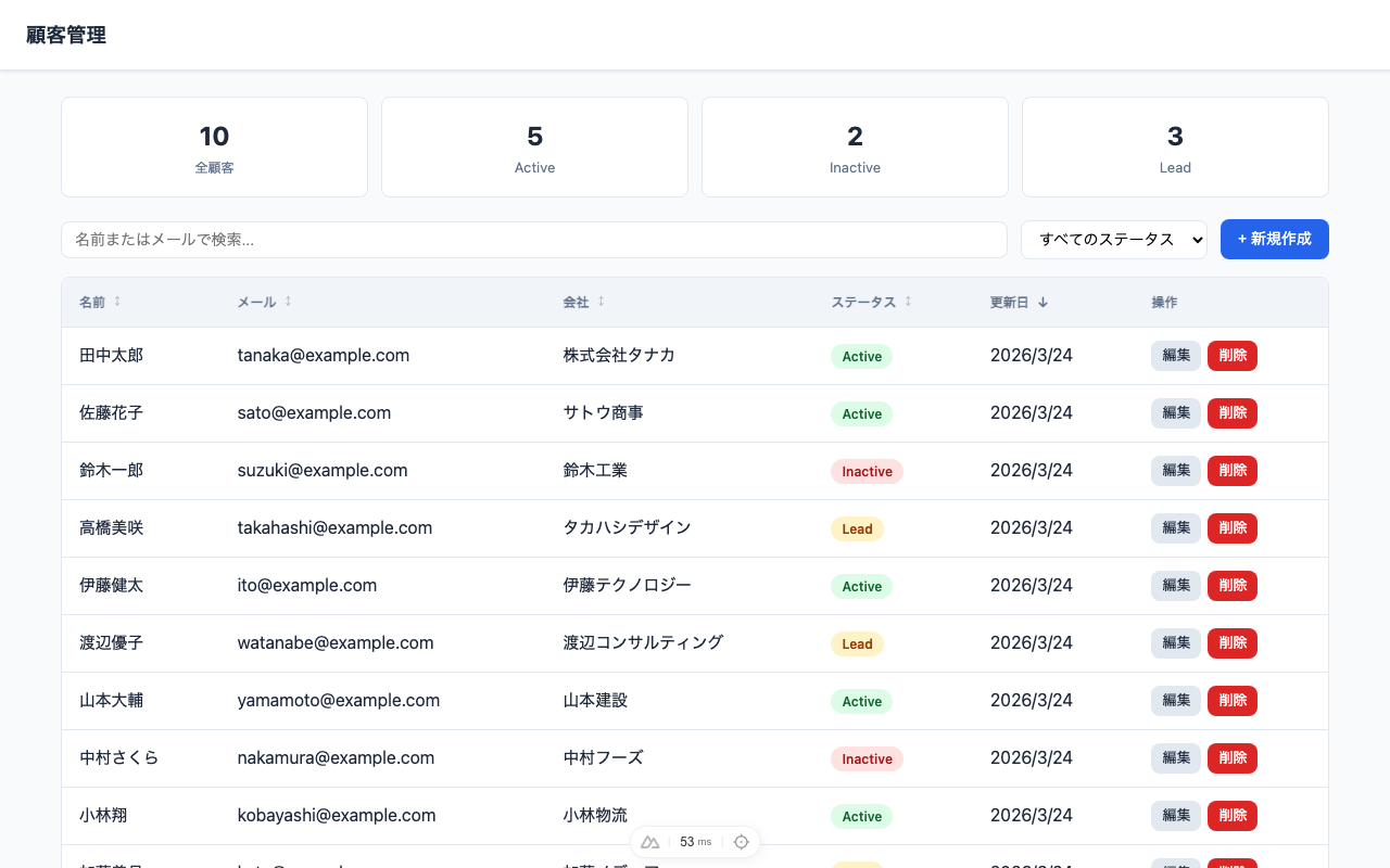 - `name` / `email` / `company` / `status` / `updatedAt` を表示する