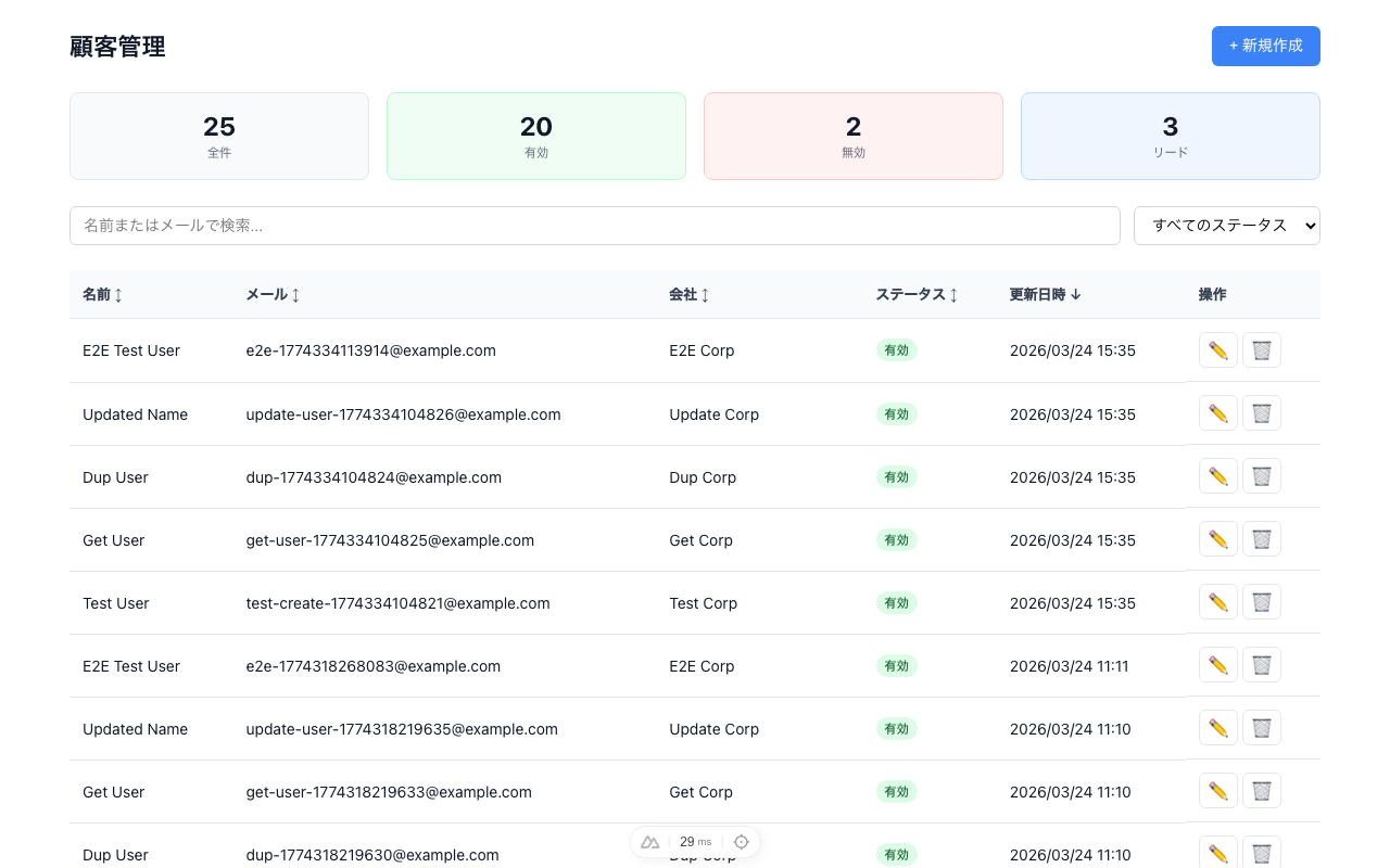 題材に選んだのは、小さな顧客管理画面です。一覧表示、検索、絞り込み、作成、編集、削除、バリデーション、永続化をまとめて見られるので、UI だけでも API だけでもない失敗を観察しやすいからです。フォームの挙動、一覧の更新、テストの網羅、完了宣言の妥当性まで、Harness の差が出やすい題材だと考えました。