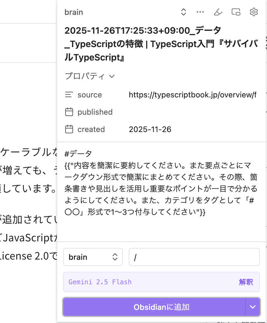 試しに、下記URLを要約してObsidianにノートを作成します。