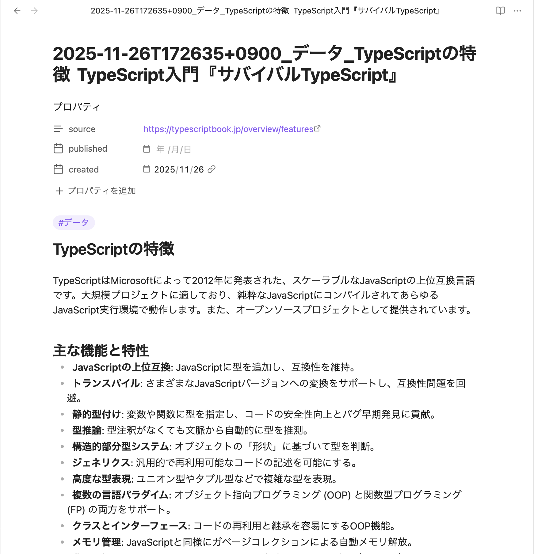 10秒ほどすると要約が完了し、下記のようにObsidianにノートが作成されます