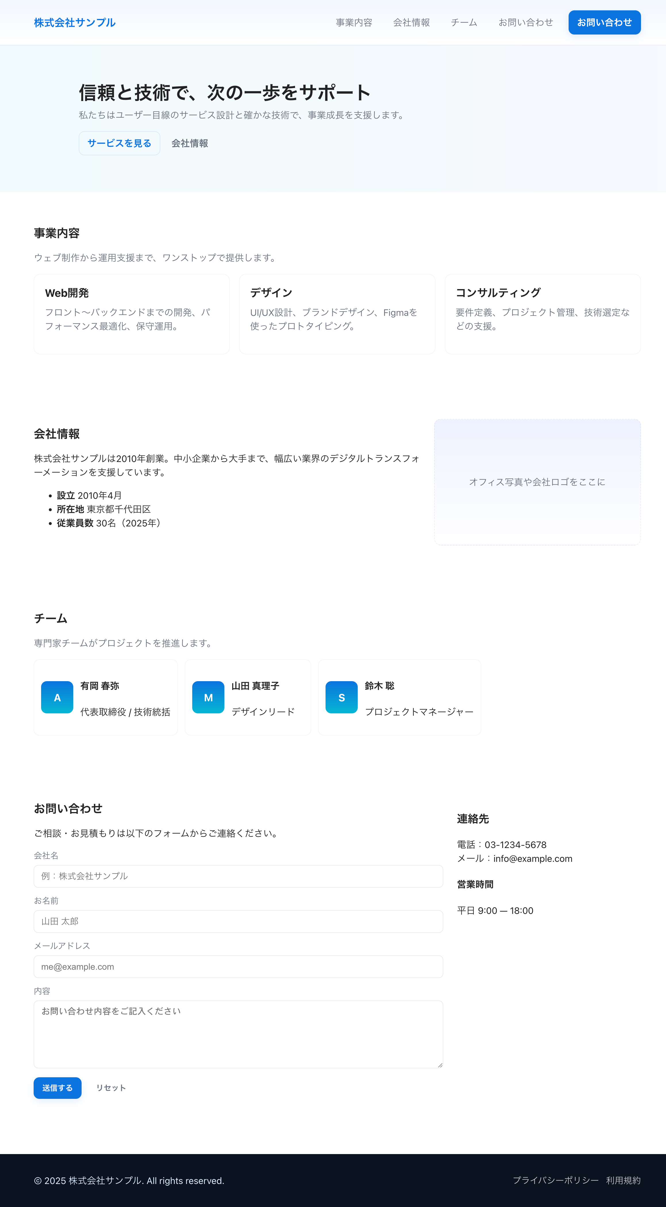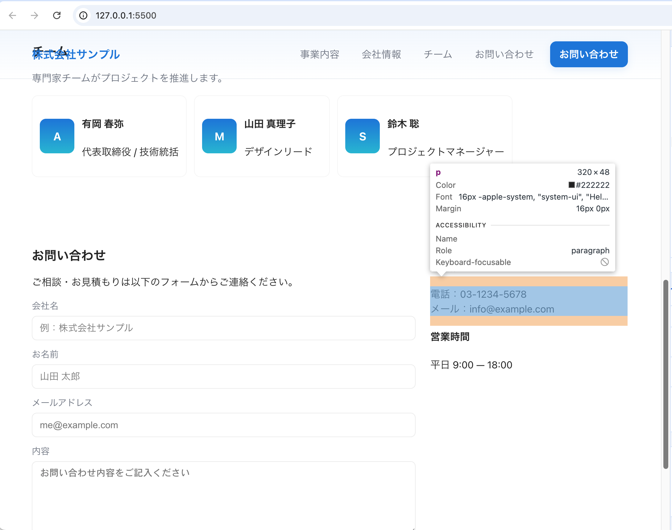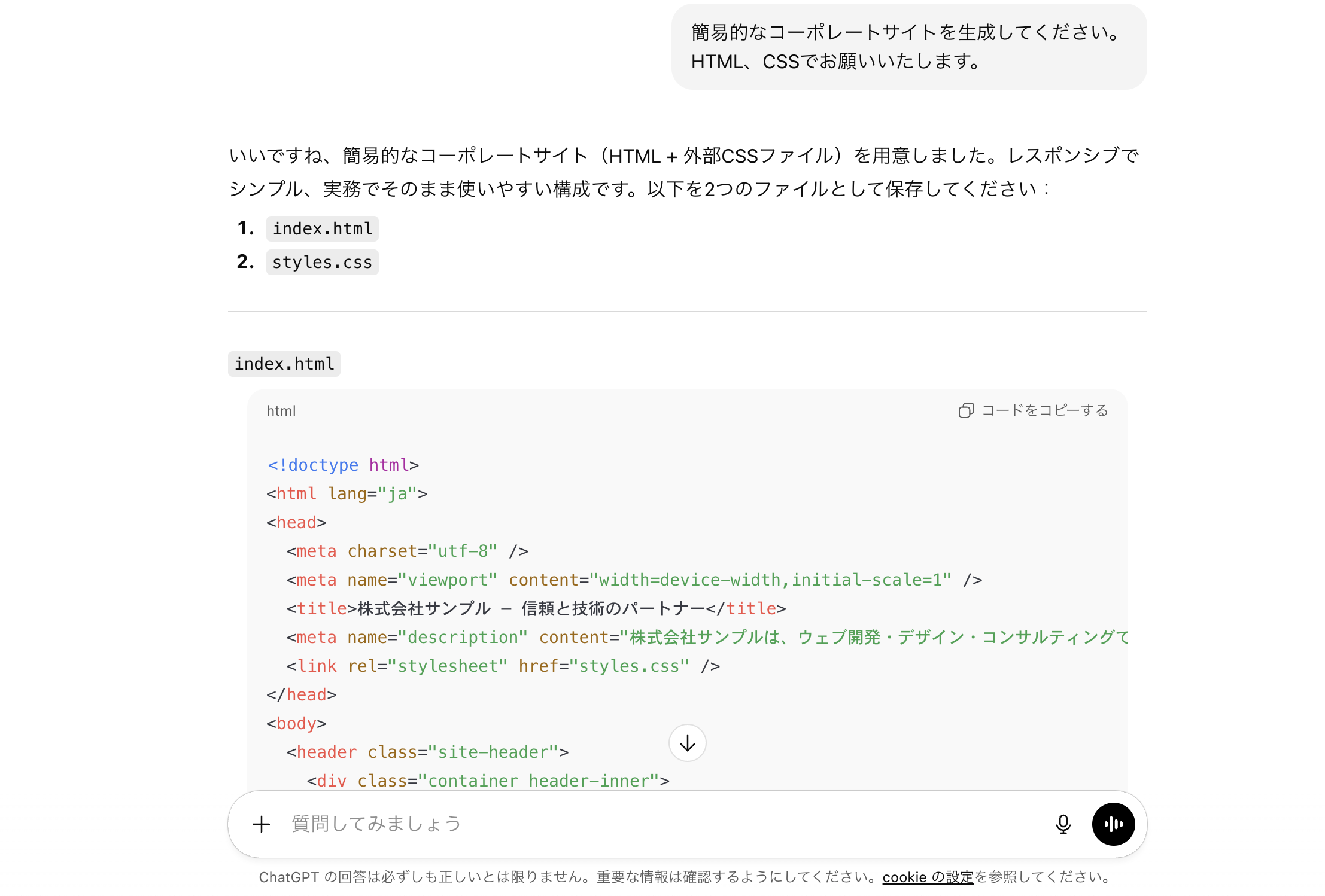 まず元となるHTML、CSSを用意します。(今回はテストの為、chatGPTで生成。)